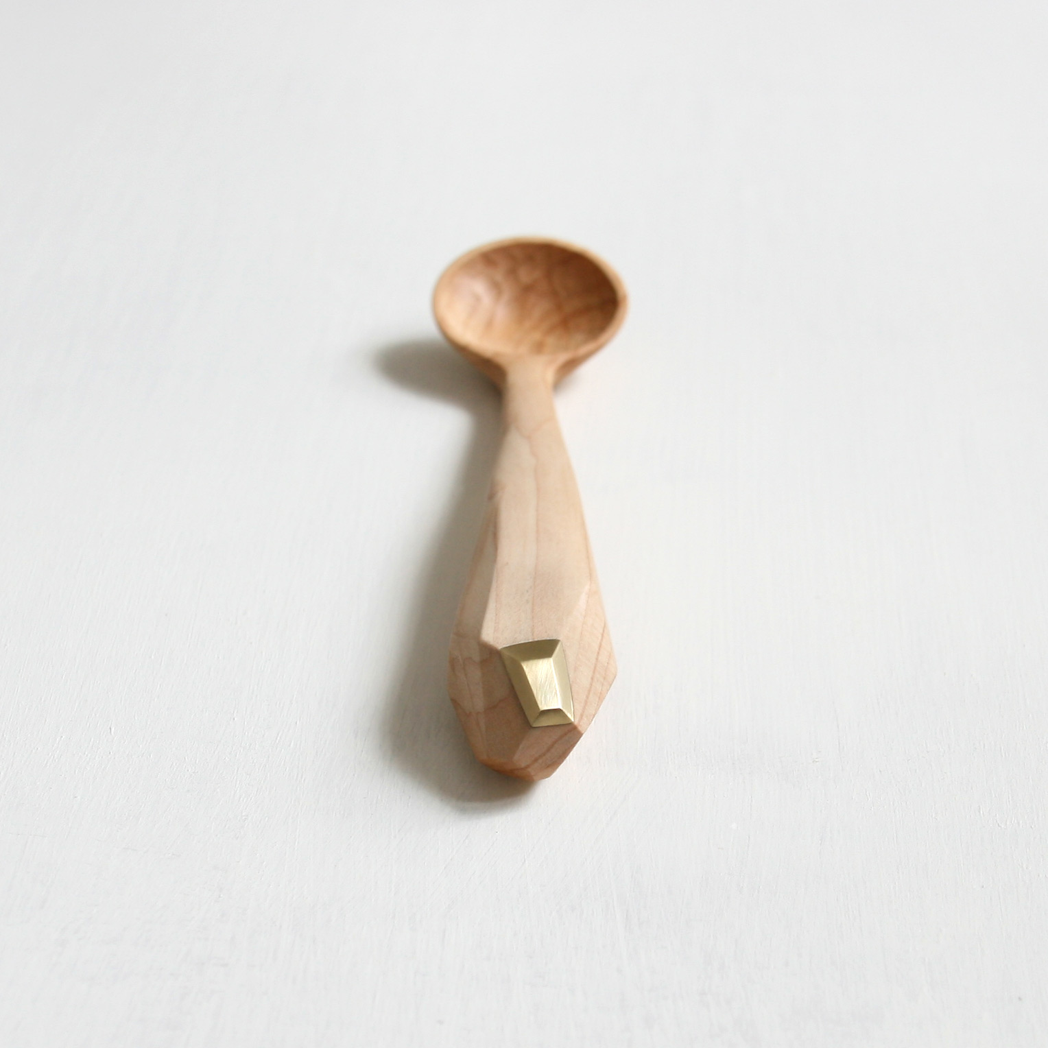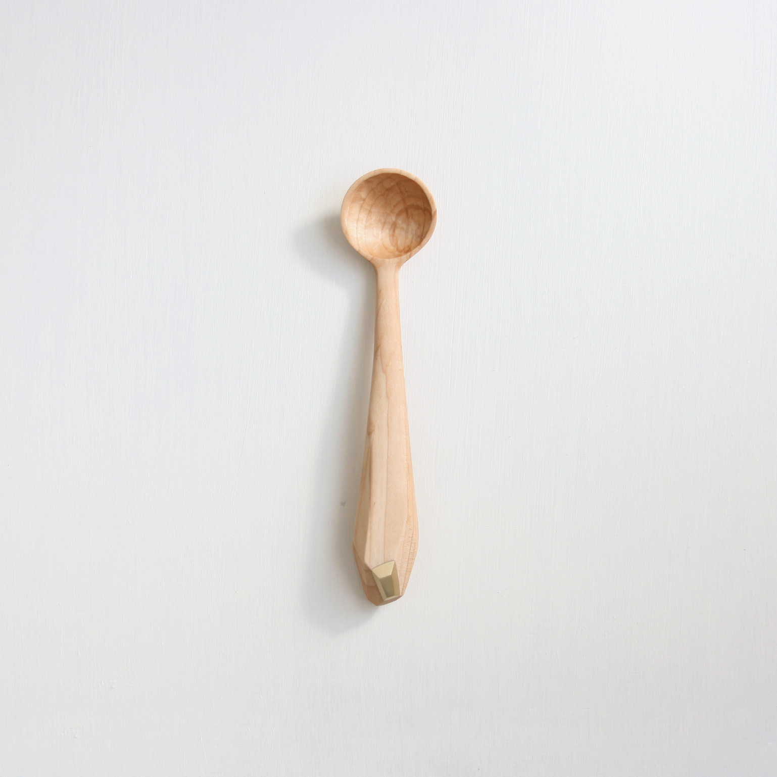 A hand carved, slightly curved maple spoon with facet-cut handle and fat brass overlay.
